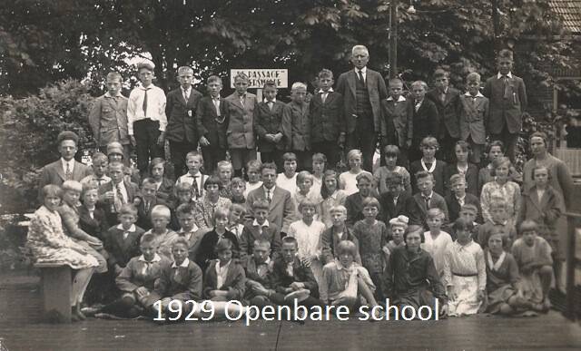 Tweede rij: Freerk Boels, Harm Boels, Albert Arnoldus, Jan Arnoldus, Elze Arnoldus, Jan Zwaneveld, Hendrik Arnoldus, Freerk Kuper, Willem Reints, Hemmo Zwaneveld, juffrouw Krol.